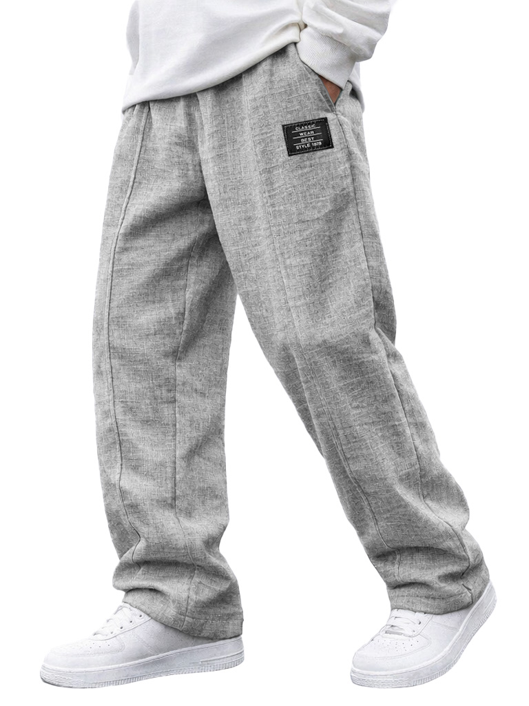 Men's Fashionable Casual Linen Pants with Elastic Waist, Embroidered Logo Pockets