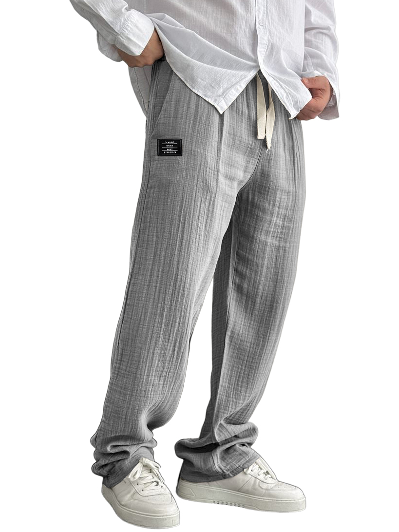 Men's Breathable Linen Pants Resort Casual Loose-Fit Trousers with Embroidered Leather Patch