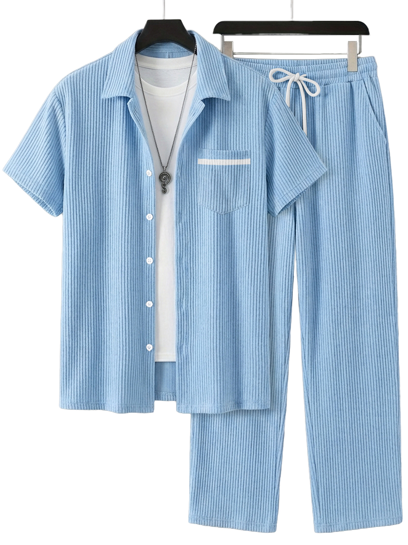 Men's Simple Casual Ribbed Pocket Short-Sleeved Shirt and Casual Pants Set OOTD