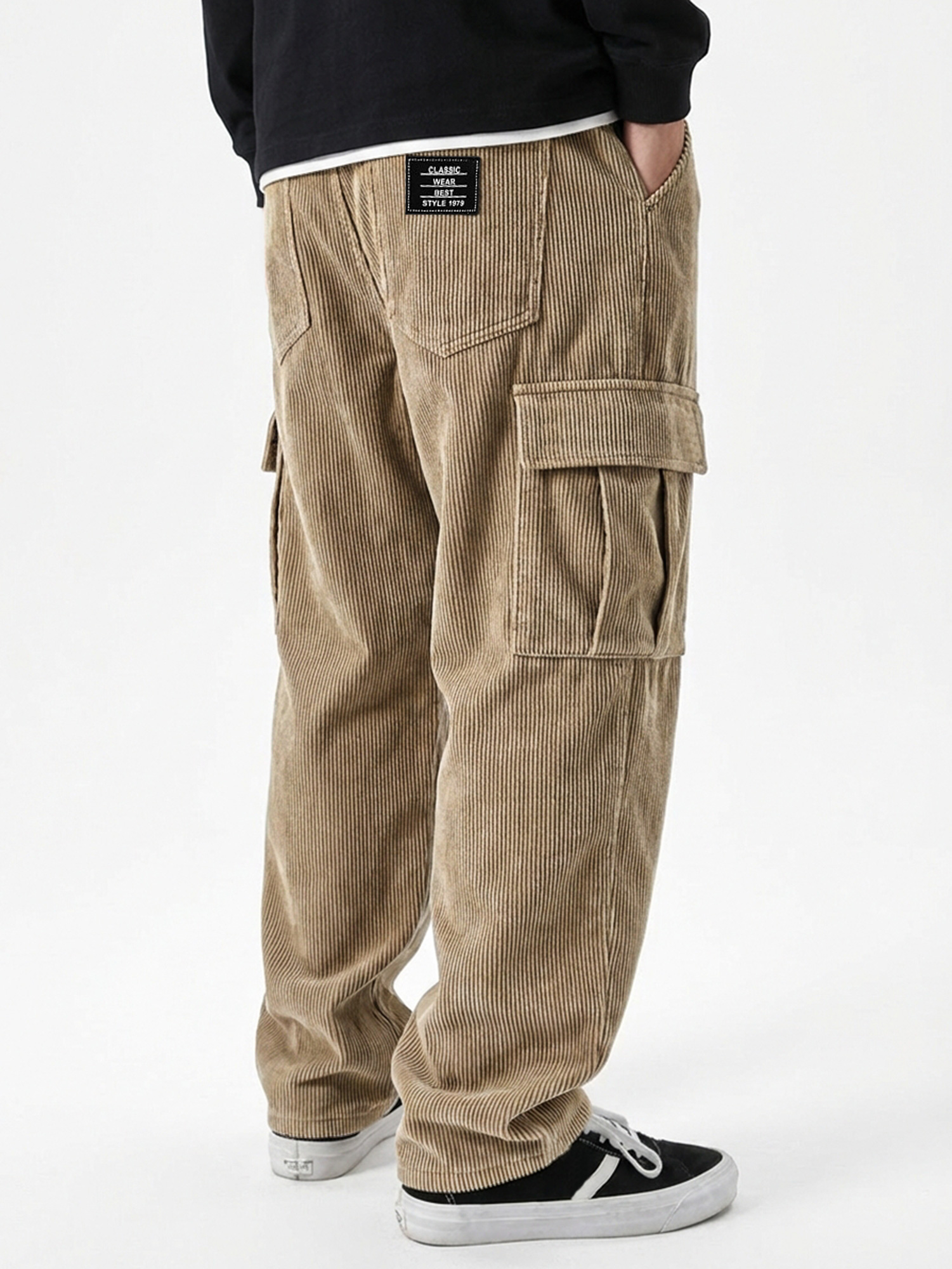 Corduroy Waffle Trousers with Multiple Pockets and Embroidered Tags