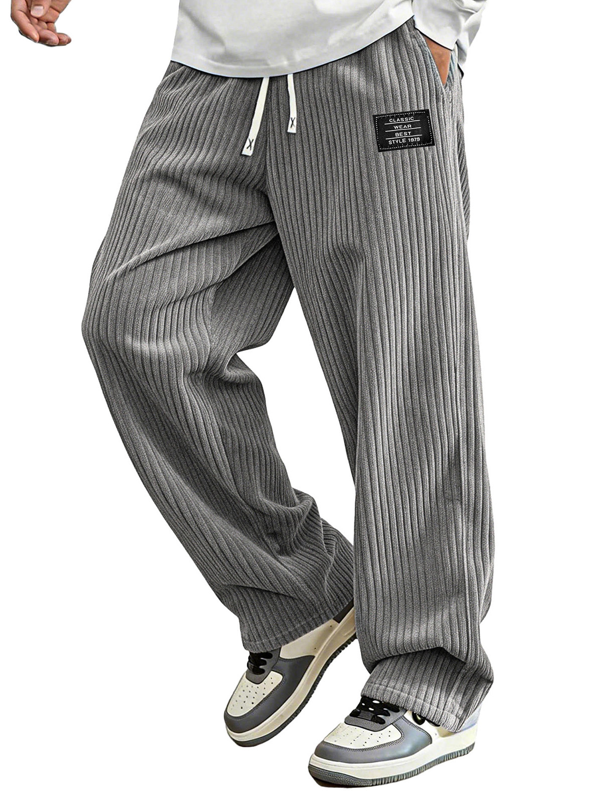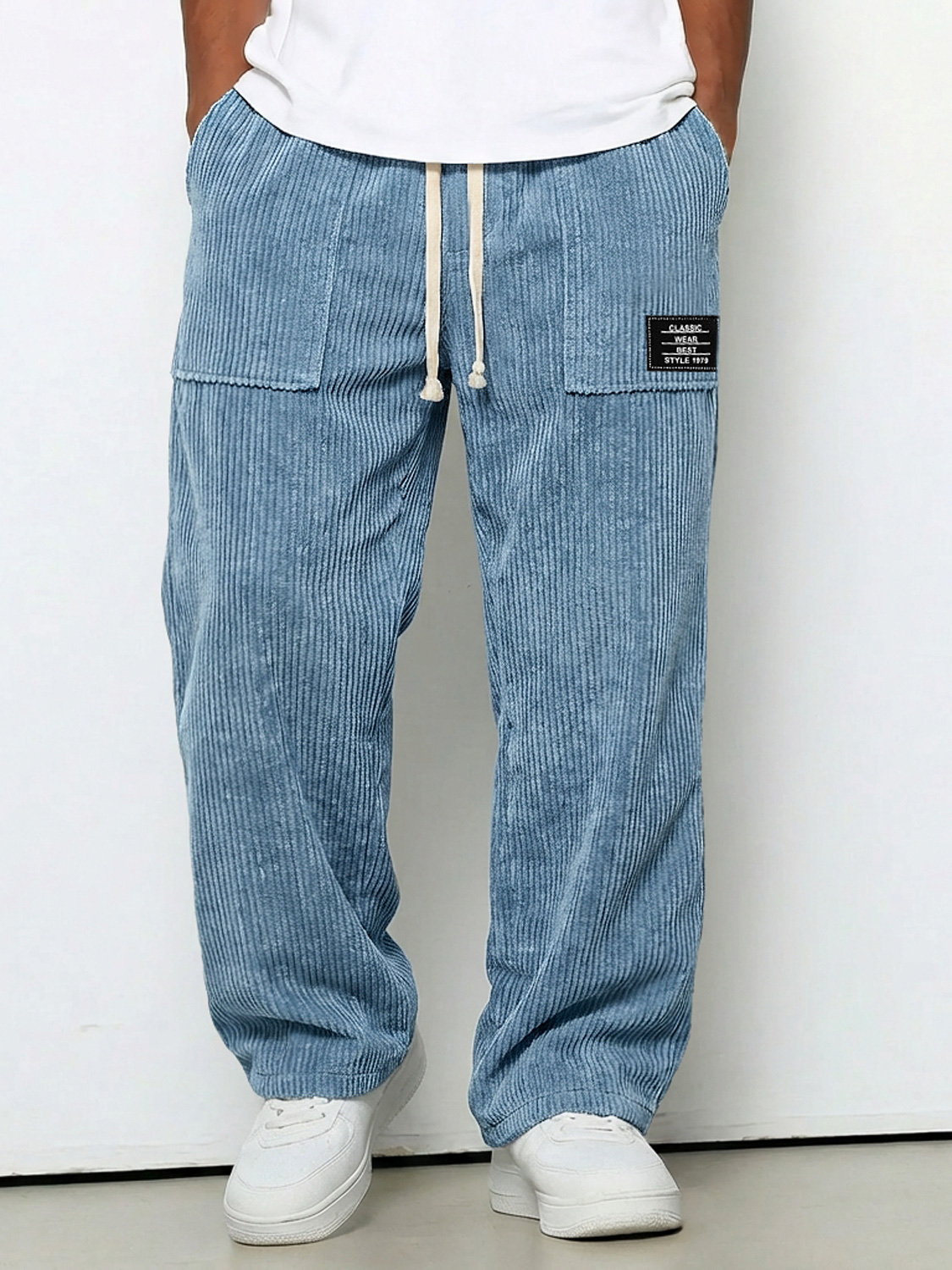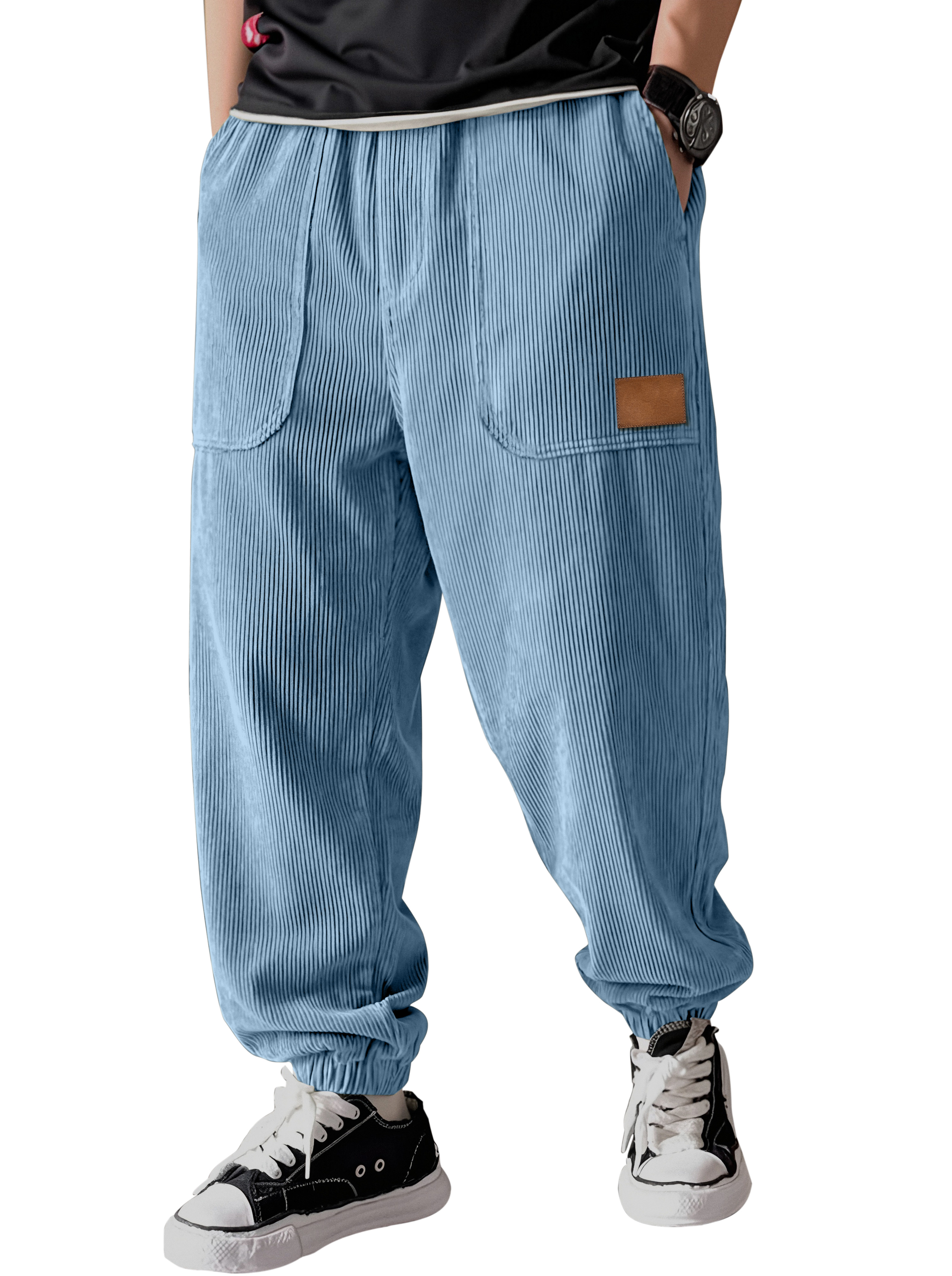 Men's Casual Corduroy Pants With Patch Pockets, Embroidered Logo, And Elastic Waistband
