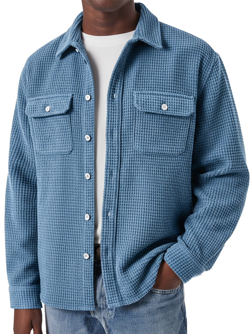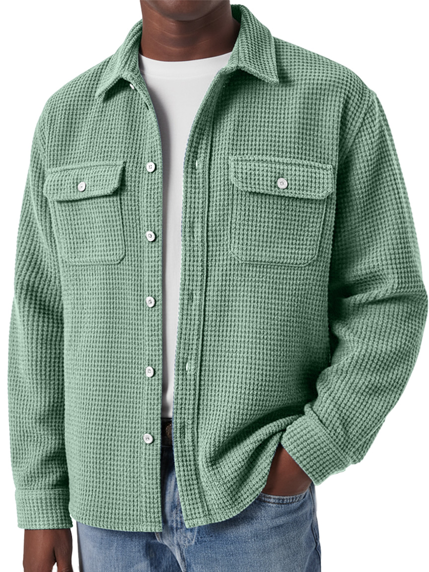Men's Retro Waffle Double Pocket Casual Loose Long Sleeve Shirt