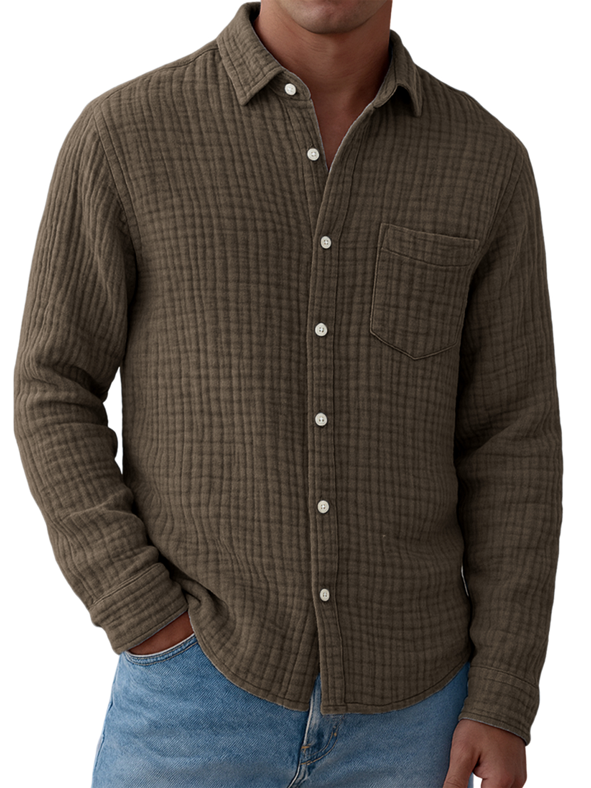 Men's Comfort Gauze Pleated Pocket Cotton Long Sleeve Shirt