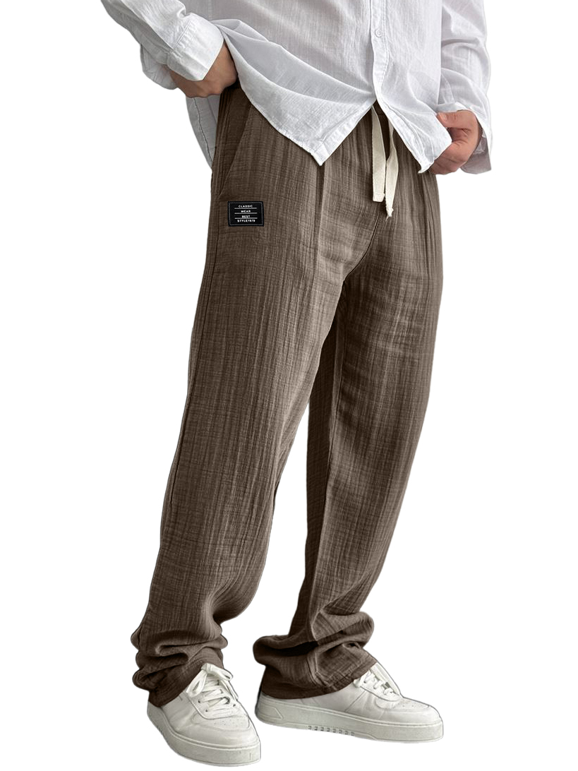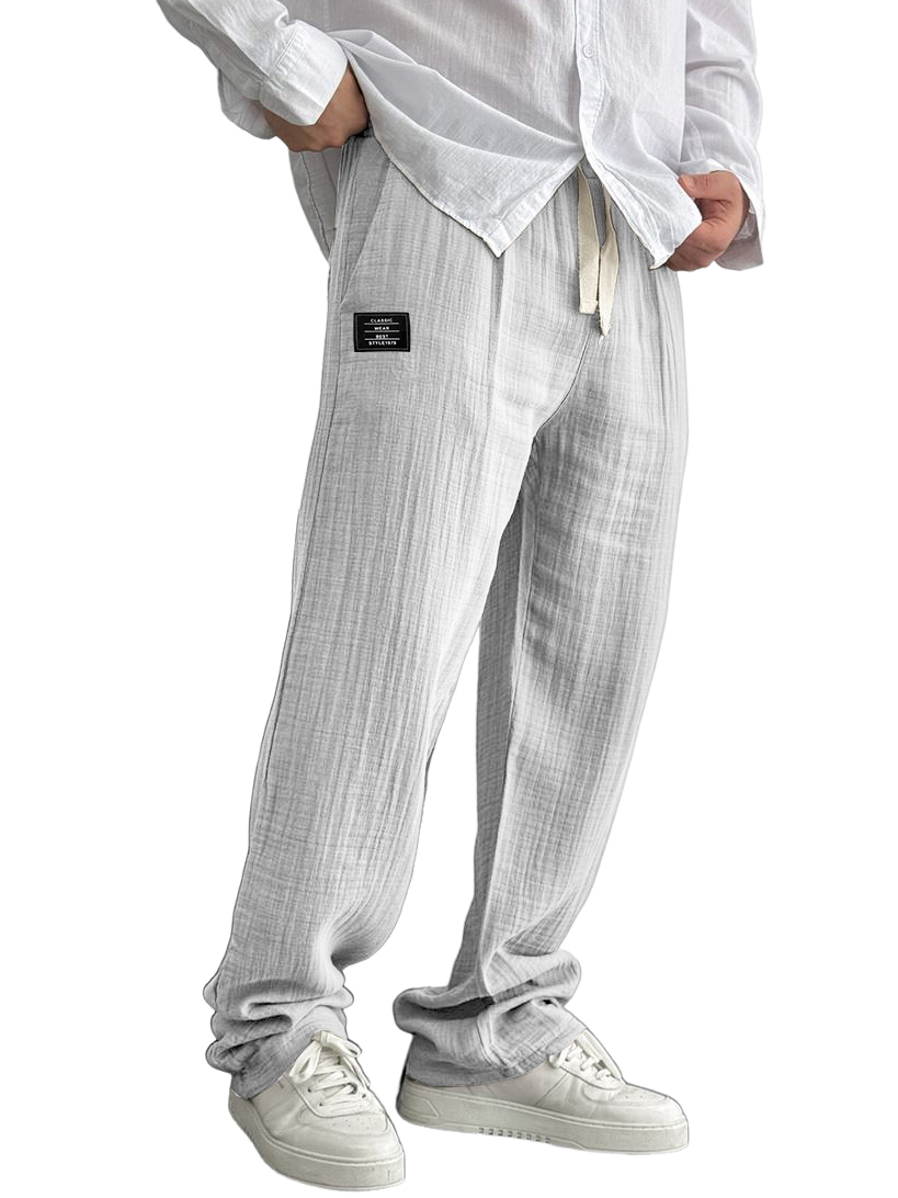 Men's Cotton And Linen Casual Embroidered Logo Drawstring Loose Elastic Waist Pocket Trousers