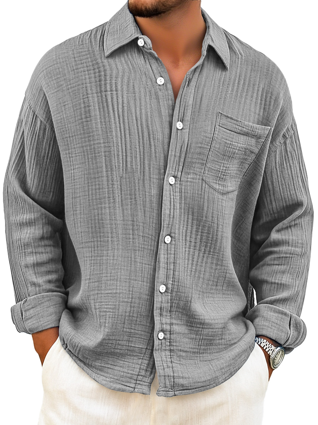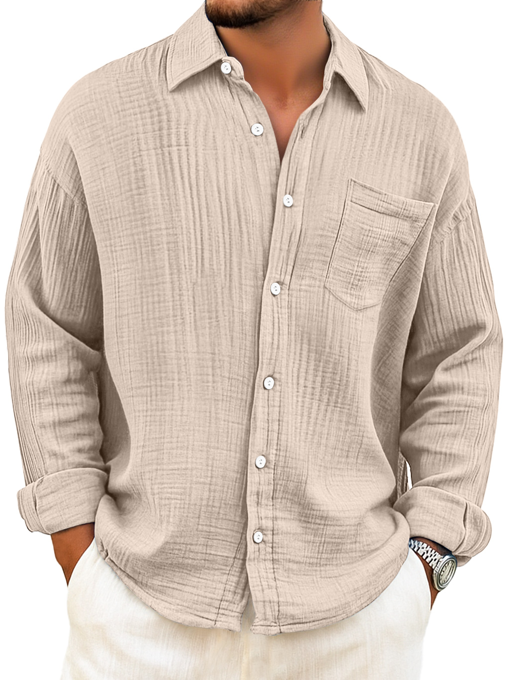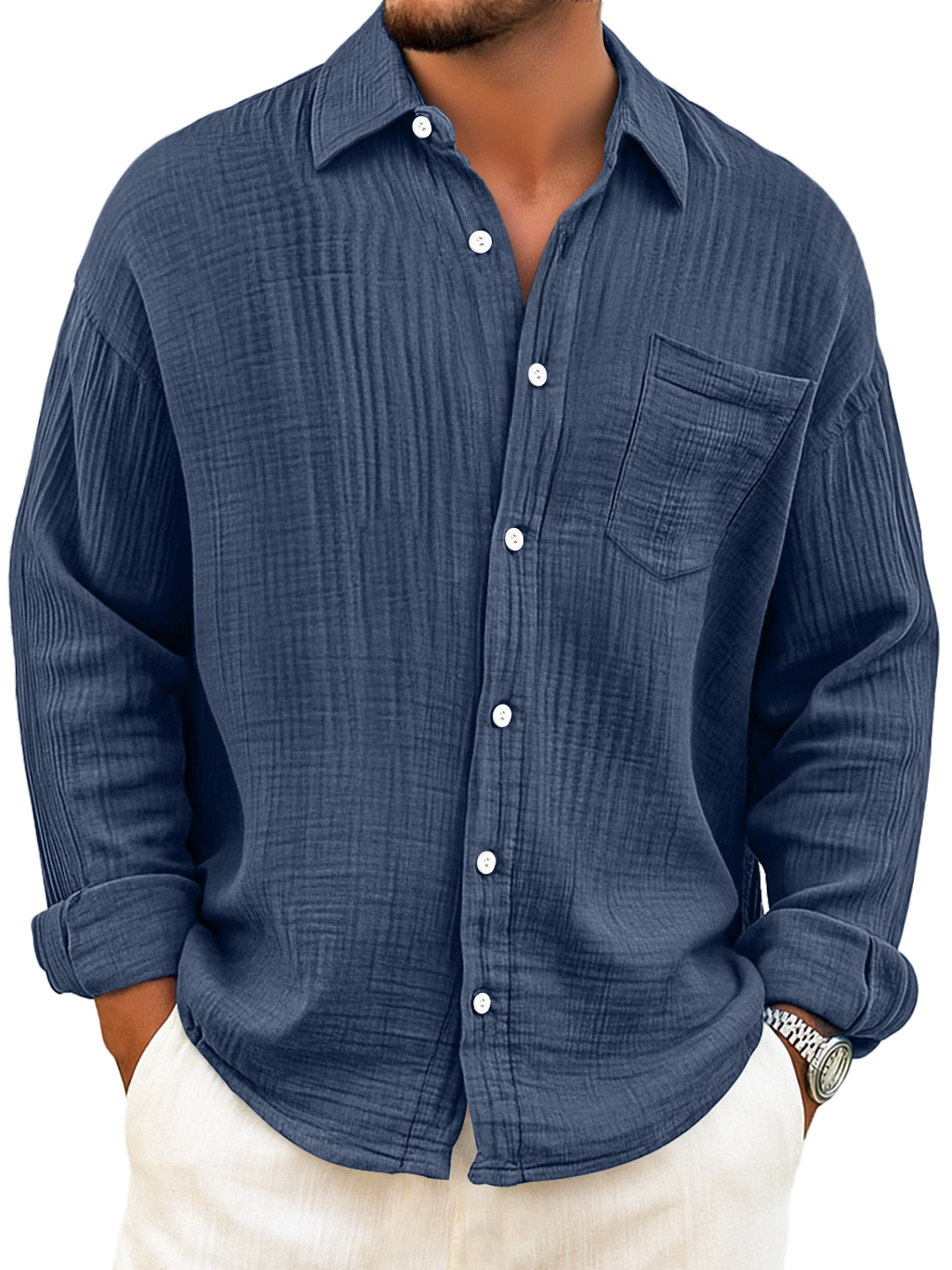 Men's Daily Breathable Cotton Pleated Casual Pocket Long Sleeve Shirt
