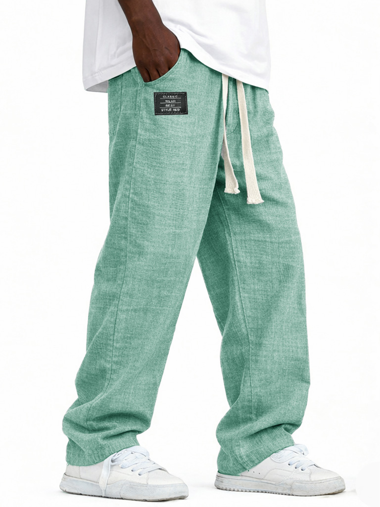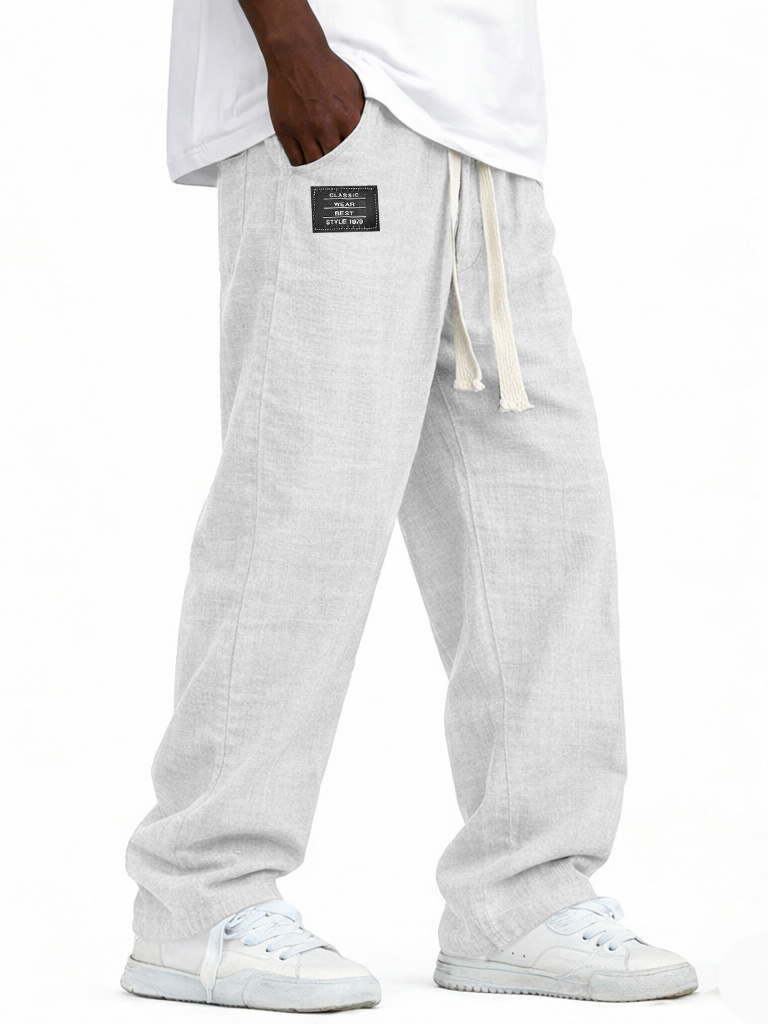 Men's Fashionable Casual Linen Pants with Elastic Waist, Embroidered Logo Pockets